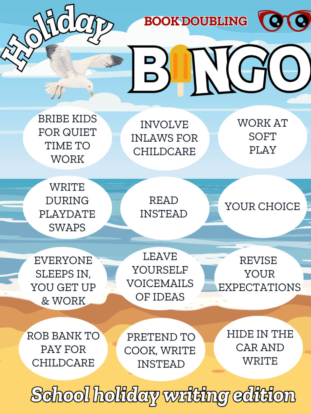 With spaces like ‘bribe kids for quiet’ and ‘write during play dates’ this could be my favourite yet! Pick some squares and play along.