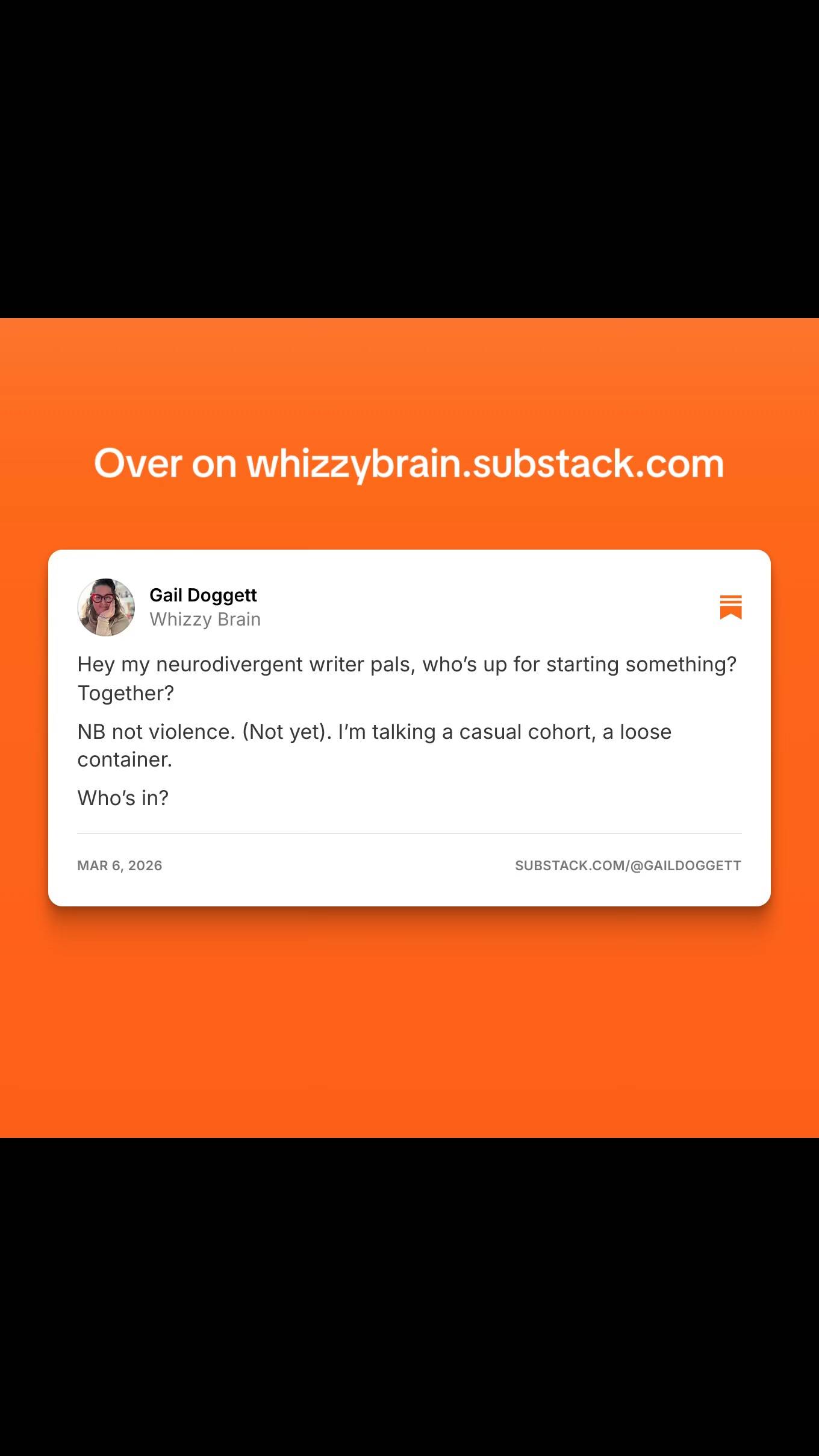 Hi, Reader! Hello! I’m thinking about running some workshops, which might be right up your alley - or not, at all. So I thought I’d ask. This isn’t a “please fill in this survey” thing, more that I’m honestly figuring out what would be most useful. You’re one of my newsletter subscribers, and I’d like to make Whizzy Brain useful for you. Although I also realise I don’t actually know why you’re here, which feels like something I probably should have asked before now. Maybe you’re interested in...